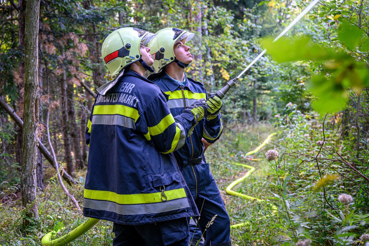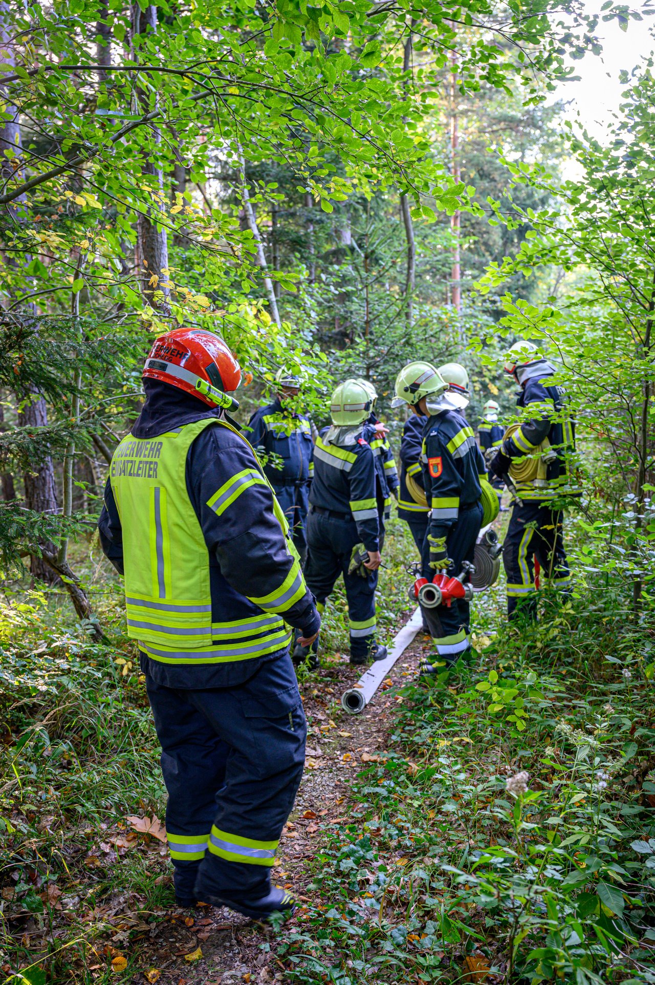 Wegen des angenommenen Funkenflugs entstand im weiteren Verlauf der Übung ein Waldbrand, der von zwei Seiten mittels vier C-Strahlrohren bekämpft wurde. Nach rund einer Stunde konnte die Übung erfolgreich beendet werden.